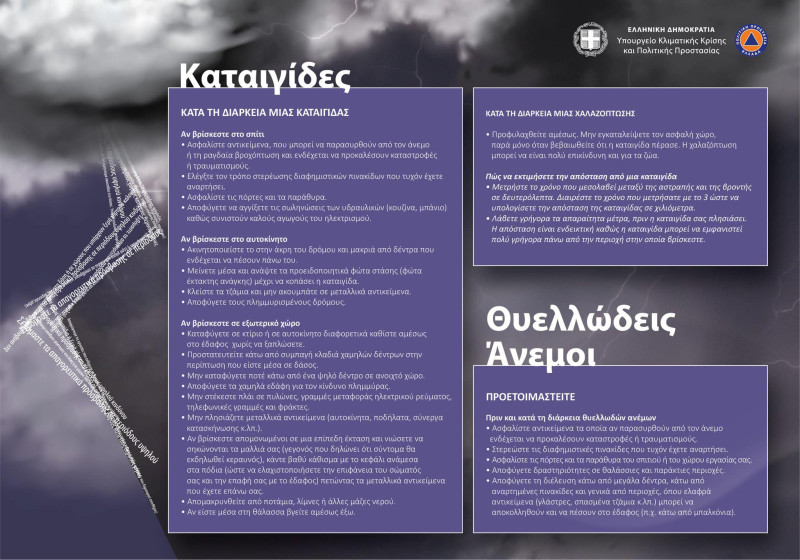 Παράλληλα, η Γενική Γραμματεία Πολιτικής Προστασίας συνιστά στους πολίτες να είναι ιδιαίτερα προσεκτικοί, μεριμνώντας για τη λήψη μέτρων αυτοπροστασίας από κινδύνους που προέρχονται από την εκδήλωση των έντονων καιρικών φαινομένων. Για πληροφορίες και οδηγίες αυτοπροστασίας από τα έντονα καιρικά φαινόμενα, οι πολίτες μπορούν να επισκεφθούν την ιστοσελίδα www.civilprotection.gr
