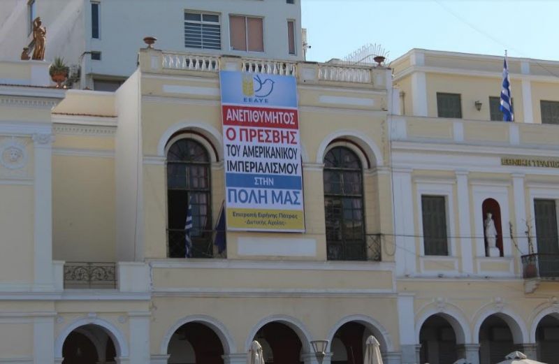 Πανό με σύνθημα «ΑΝΕΠΙΘΥΜΗΤΟΣ Ο ΠΡΕΒΗΣ ΤΟΥ ΑΜΕΡΙΚΑΝΙΚΟΥ ΙΜΠΕΡΙΑΛΙΣΜΟΥ ΣΤΗΝ ΠΟΛΗ ΜΑΣ», ανάρτησε η Επιτροπή Ειρήνης Πάτρας – Δυτικής Αχαΐας στην πλατεία Γεωργίου. καταγγέλλοντας την συμμετοχή του Αμερικάνου Πρέσβη στον ποδηλατικό δρόμο θυσίας.