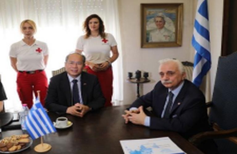 Μια ιδιαίτερα τιμητική και χαρούμενη ημέρα η σημερινή για τον Ελληνικό Ερυθρό Σταυρό (Ε.Ε.Σ.), καθώς ο Πρέσβης της Κίνας, Σιάο Τζουντσένγκ, επισκέφθηκε με τους συνεργάτες του τα Κεντρικά Γραφεία του Ε.Ε.Σ. στην Αθήνα, προκειμένου να παραδώσει επιταγή 100.000 δολαρίων στον Πρόεδρο του Ε.Ε.Σ, Dr. Αντώνιο Αυγερινό.