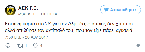 Θέση για την επίμαχη φάση της αποβολής του Ούγκο Αλμέιδα πήρε η Α.Ε.Κ. μέσω του επίσημου λογαριασμού της ομάδας στο Twitter.