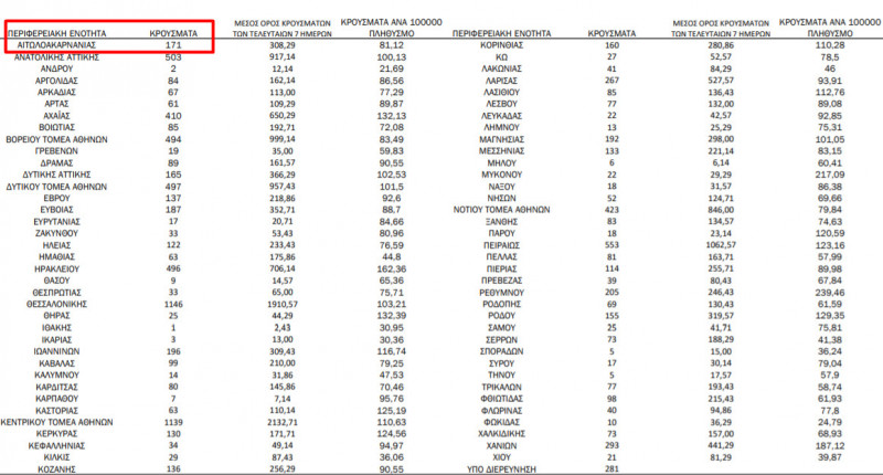 Η κατανομή των 10.719 νέων εγχώριων κρουσμάτων ανά Περιφερειακή Ενότητα παρουσιάζεται στον κατωτέρω πίνακα: