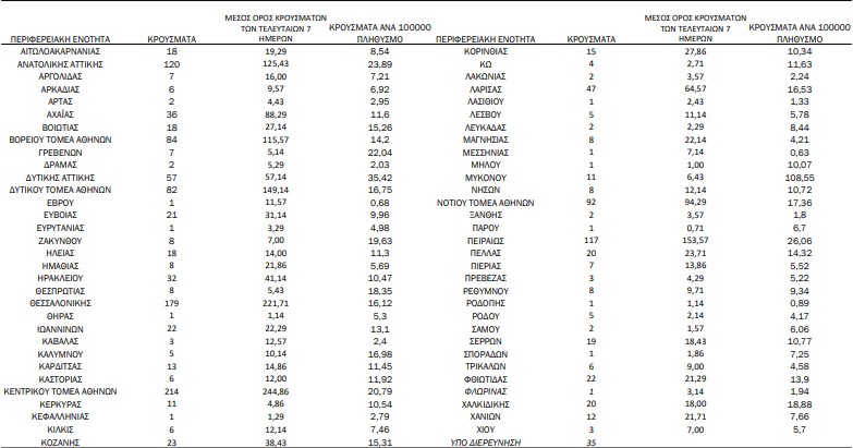 Η κατανομή των 1.502 νέων εγχώριων κρουσμάτων ανά Περιφερειακή Ενότητα παρουσιάζεται στον κατωτέρω πίνακα: