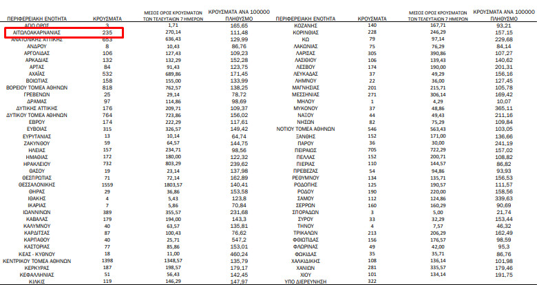 Ε.Ο.Δ.Υ.: 235 νέα κρούσματα στην Π.Ε. Αιτωλοακαρνανίας