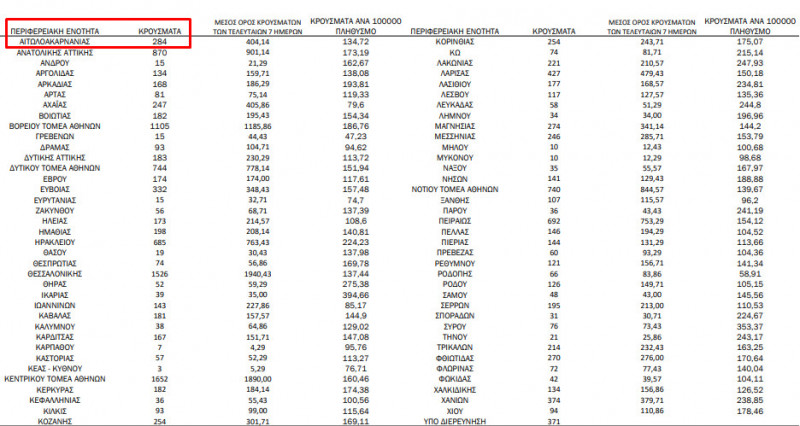 Η κατανομή των 16.535 νέων εγχώριων κρουσμάτων ανά Περιφερειακή Ενότητα παρουσιάζεται στον κατωτέρω πίνακα: