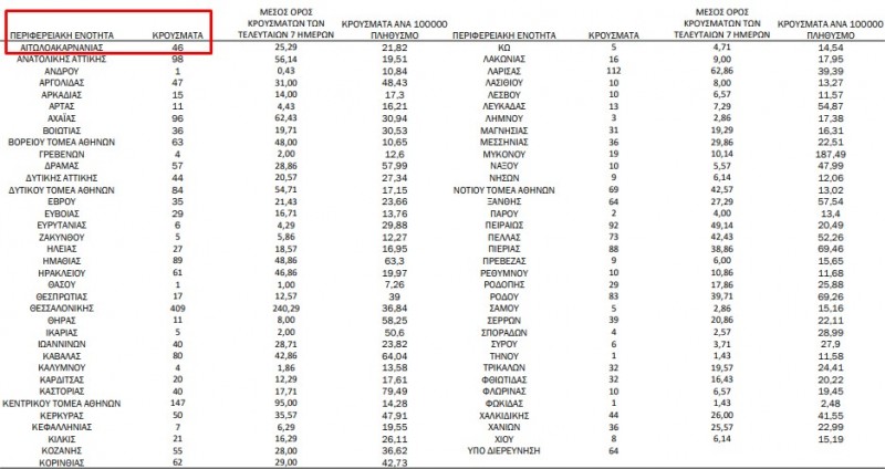 Η κατανομή των 2.898 νέων εγχώριων κρουσμάτων ανά Περιφερειακή Ενότητα παρουσιάζεται στον κατωτέρω πίνακα: