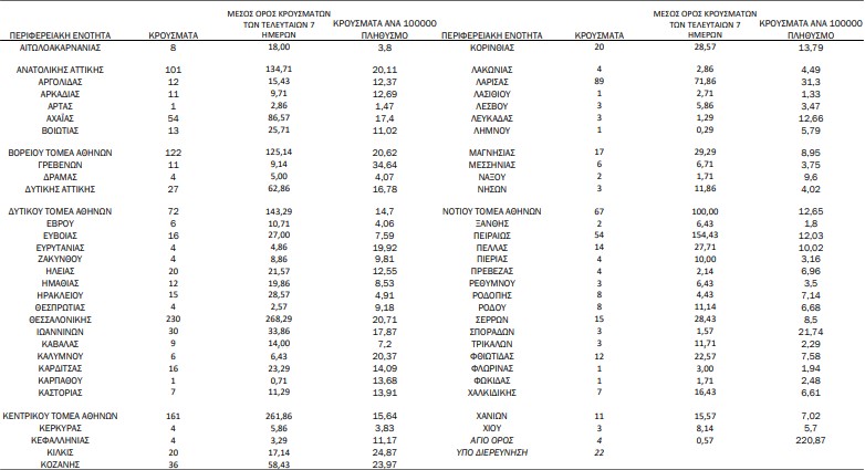 Η κατανομή των 1.436 νέων εγχώριων κρουσμάτων ανά Περιφερειακή Ενότητα παρουσιάζεται στον κατωτέρω πίνακα: