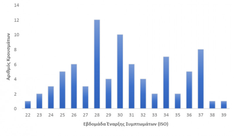 Ο συνολικός αριθμός των εργαστηριακά επιβεβαιωμένων κρουσμάτων από την έναρξη της καταγραφής ανέρχεται σε 82 (όλοι άνδρες, διάμεση ηλικία: 37 έτη (19-61), εκ των οποίων 23 ανέφεραν ταξίδι στο εξωτερικό εντός του χρόνου επώασης της νόσου (28%). Η χρονική κατανομή των εργαστηριακά επιβεβαιωμένων κρουσμάτων ανά εβδομάδα έναρξης συμπτωμάτων (εβδομάδα κατά ISO) παρουσιάζεται στο παρακάτω Γράφημα.
