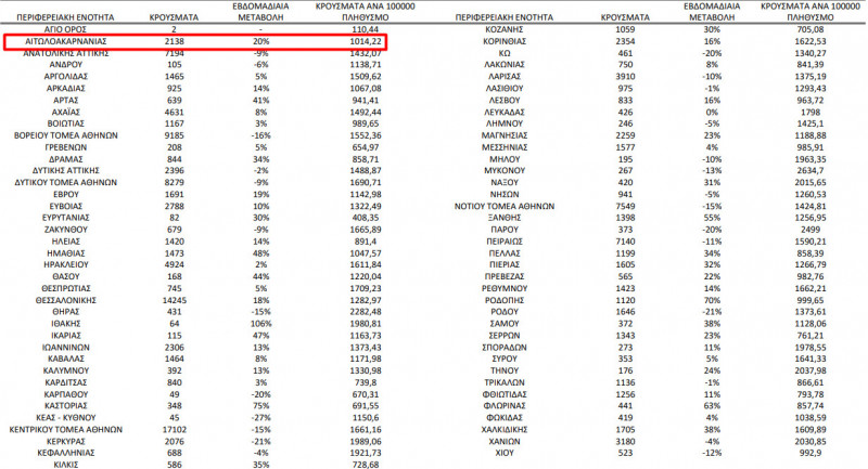 Ε.Ο.Δ.Υ.: Στον Πίνακα παρουσιάζεται τo σύνολο των κρουσμάτων, η επίπτωση ανά 100.000 πληθυσμού καθώς και η εβδομαδιαία μεταβολή των επιβεβαιωμένων κρουσμάτων Covid-19 ανά Περιφερειακή Ενότητα την εβδομάδα αναφοράς σε σύγκριση με την προηγούμενη εβδομάδα.