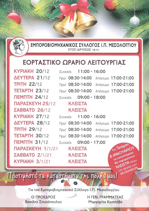 Ανακοινώθηκε από τον Εμποροβιομηχανικό Σύλλογο Ι.Π. Μεσολογγίου, το ωράριο λειτουργίας των καταστημάτων κατά την εορταστική περίοδο: