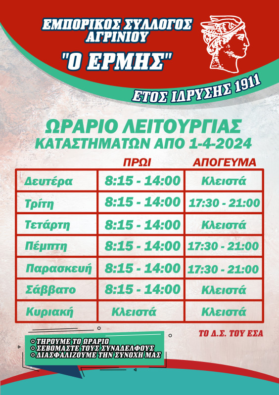 Δείτε το ωράριο καταστημάτων που θα ισχύει από την 1η Απριλίου, σύμφωνα με την ανακοίνωση που εξέδωσε ο Εμπορικός Σύλλογος Αγρινίου «Ο ΕΡΜΗΣ»