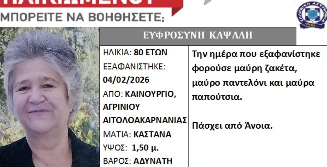 Η Ευφροσύνη Καψάλη εξαφανίστηκε από το Καινούργιο Αγρινίου στις 4 Φεβρουαρίου 2026 και πλέον έχει σημάνει Silver Alert για την 80χρονη.