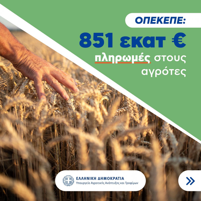 - Από τον ΟΠΕΚΕΠΕ: 851,6 εκατ. ευρώ για εξόφληση της ενιαίας ενίσχυσης.