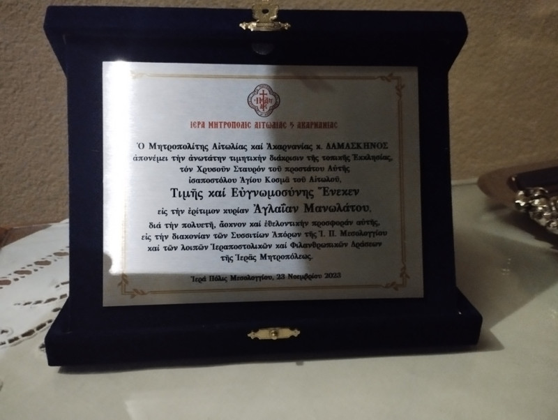 Ο Αρχιερατικός Επίτροπος Μεσολογγίου, Αρχιμ. Αναστάσιος Καντάνης αναφέρθηκε στο έργο και την προσφορά των δύο κυριών, οι οποίες για πολλά χρόνια διακονούν εθελοντικά στο κατηχητικό, νεανικό, κοινωνικό, ιεραποστολικό και φιλανθρωπικό έργο της Ιεράς Μητροπόλεως. Ακολούθως η κ. Αγλαΐα Μανωλάτου ευχαρίστησε τον Σεβασμιώτατο για την τιμή, που, όπως είπε, έχει ως αποδέκτη όλες τις εθελόντριες που εργάζονται στην τοπική μας Εκκλησία.