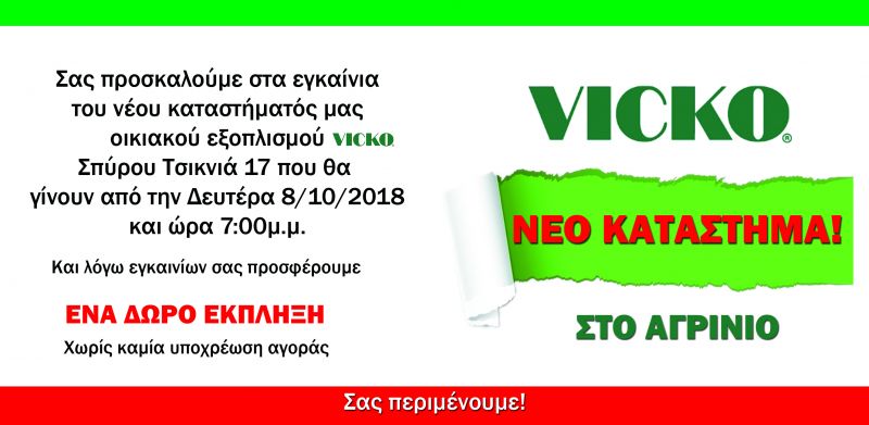 Με μεγάλη μας χαρά σας προσκαλούμε στα εγκαίνια του νέου καταστήματος Vicko στο Αγρίνιο!