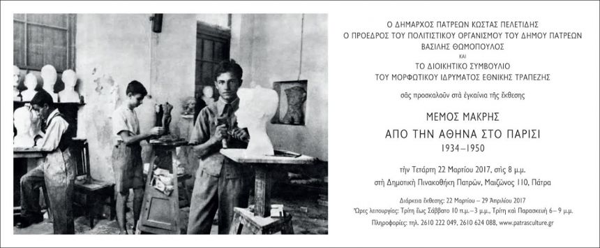 Με τίτλο «Μέμος Μακρής – Από την Αθήνα στο Παρίσι 1934-1950», στις 8.00 το βράδυ ανοίγει τις πύλες της η έκθεση που διοργανώνει ο Πολιτιστικός Οργανισμός του Δήμου Πατρέων σε συνεργασία με το Μορφωτικό Ίδρυμα Εθνικής Τραπέζης.