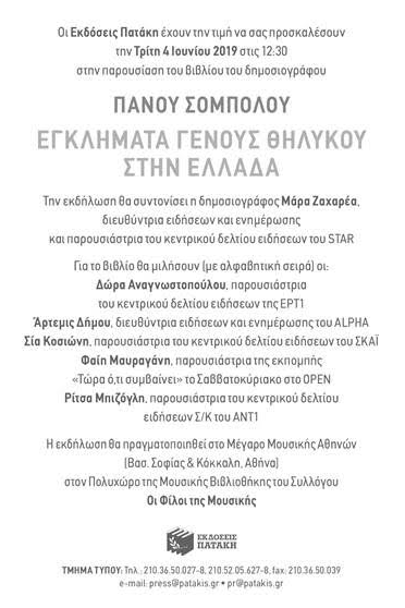 Οι Εκδόσεις Πατάκη έχουν την τιμή να σας προσκαλέσουν την Τρίτη 04 Ιουνίου 2019 και ώρα 12:30 στην παρουσίαση του βιβλίου του δημοσιογράφου Πάνου Σόμπολου «Εγκλήματα Γένους Θηλυκού στην Ελλάδα».