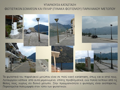 Η αναγκαιότητα οδοφωτισμού τόσο στο παραλιακό μέτωπο όσο και στον πεζόδρομο του Μύτικα είναι αυτονόητη. Συγκεκριμένα αυτή τη στιγμή δεν λειτουργούν τα εναέρια φωτιστικά του κεντρικού πεζοδρόμου, καθώς επίσης δε λειτουργούν και τα φωτιστικά σώματα κατά μήκος του παραλιακού μετώπου, αφού τα περισσότερα από αυτά είναι παντελώς κατεστραμμένα. Η κάκιστη κατάσταση που επικρατεί, δημιουργεί την εικόνα της πλήρους εγκατάλειψης και παρακμής.