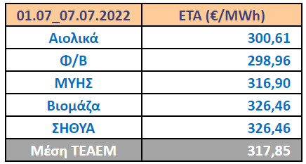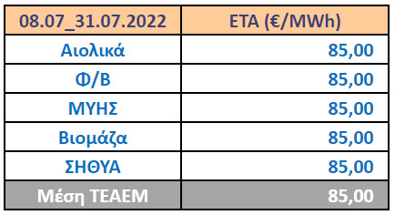 Σε εφαρμογή των διατάξεων της Υ.Α. ΑΠΕΗΛ/Α/Φ1/οικ.187480 (ΦΕΚ Β΄3955/09.12.2016), όπως τροποποιήθηκε και ισχύει, και σύμφωνα με το Άρ. 64 του Ν.4986/2022 (ΦΕΚ Α’ 204/28.10.2022) ο οποίος νόμος ισχύει για το διάστημα εφαρμογής του Προσωρινού Μηχανισμού Επιστροφής Μέρους Εσόδων Αγοράς Επόμενης Ημέρας, η Ειδική Τιμή Αγοράς (Ε.Τ.Α.) ανά τεχνολογία Α.Π.Ε. και Σ.Η.Θ.Υ.Α. για το διάστημα από 1ης Ιουλίου έως την έναρξη εφαρμογής του Προσωρινού Μηχανισμού (ήτοι 08.07.2022) υπολογίσθηκε ως εξής: