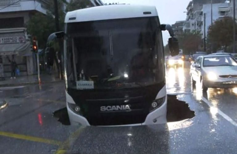 Εικόνες σοκ στη Θεσσαλονίκη – Υποχώρησε ο δρόμος και «ρούφηξε» λεωφορείο