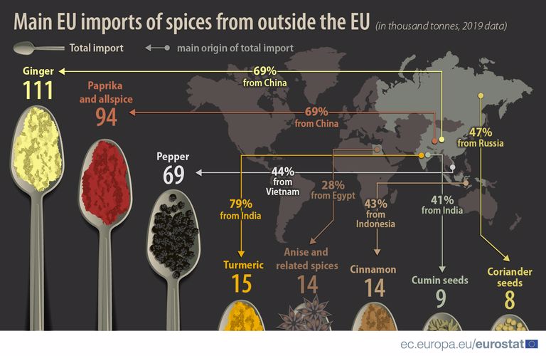 Σύμφωνα με στοιχεία της Eurostat, oι εισαγωγές τζίντζερ, πάπρικα και πιπέρι ήταν υψηλότερες από τις εισαγωγές κουρκούμη (15 000 τόνοι), οι περισσότερες από τις οποίες προέρχονταν από την Ινδία (12 000 τόνοι), γλυκάνισο και συναφή μπαχαρικά (14 000 τόνοι) εκ των οποίων η Αίγυπτος (4 000 τόνοι) ήταν κύριος προμηθευτής, καθώς και κανέλα (14 000 τόνοι), εκ των οποίων σχεδόν οι μισοί προέρχονταν από την Ινδονησία (6.000 τόνοι).