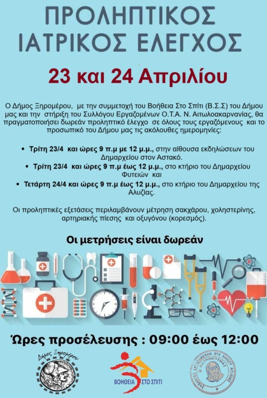 O Δήμος Ξηρομέρου, με την συμμετοχή του Βοήθεια Στο Σπίτι (Β.Σ.Σ.) του Δήμου μας και την στήριξη του Συλλόγου Εργαζομένων Ο.Τ.Α. Ν. Αιτωλοακαρνανίας, θα πραγματοποιήσει δωρεάν προληπτικό έλεγχο σε όλους τους εργαζόμενους και το προσωπικό του.