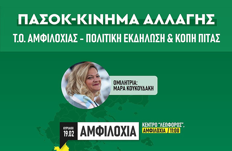 Στην Αμφιλοχία θα πραγματοποιηθεί πολιτική εκδήλωση & κοπή πίτας στις 19/2 και ώρα 11:00 στο κέντρο “ΛΕΩΦΟΡΟΣ” με ομιλήτρια την Μάρα Κουκουδάκη.