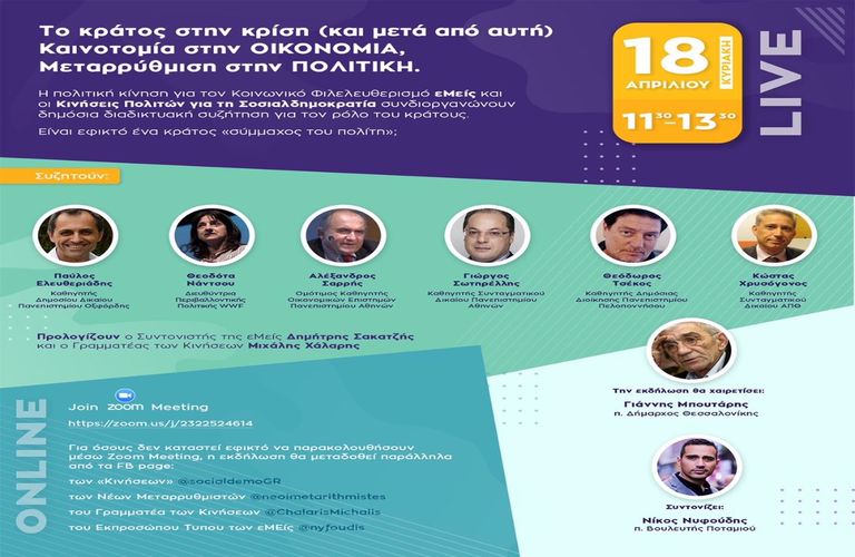 Η πολιτική κίνηση για τον Κοινωνικό Φιλελευθερισμό «εΜείς» και οι «Κινήσεις Πολιτών για τη Σοσιαλδημοκρατία» συνδιοργανώνουν δημόσια διαδικτυακή συζήτηση για τον ρόλο του κράτους και επιχειρούν να οριοθετήσουν την έννοια του κράτους ως «συμμάχου του πολίτη».