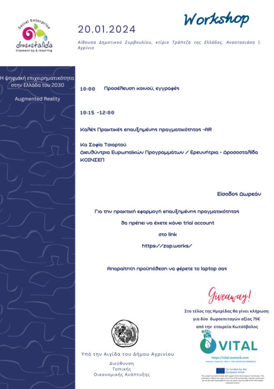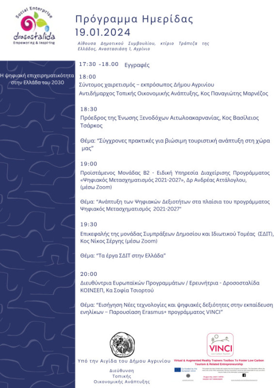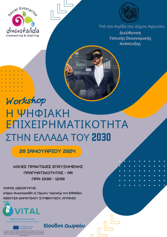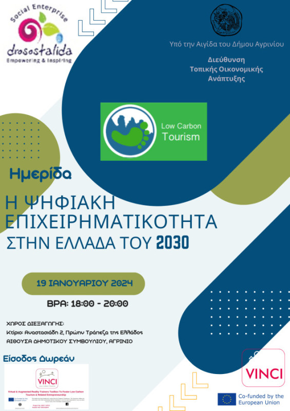 Ενημερωτική δράση με θέμα «Ψηφιακή Επιχειρηματικότητα στην Ελλάδα του 2030» θα πραγματοποιηθεί την Παρασκευή, 19 Ιανουαρίου από την Κοινωνική Συνεταιριστική Επιχείρηση «Δροσοσταλίδα» υπό την Αιγίδα του Δήμου Αγρίνιου, Διεύθυνση Τοπικής Οικονομικής Ανάπτυξης, στις 18:00 στην αίθουσα συνεδριάσεων του Δημοτικού Συμβουλίου, Αναστασιάδη 1.