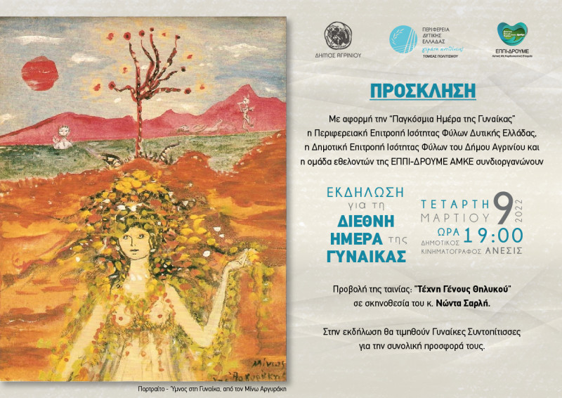 Με αφορμή την Παγκόσμια Ημέρα της Γυναίκας, η Περιφερειακή Επιτροπή Ισότητας Φύλων Δυτικής Ελλάδας, η Δημοτική Επιτροπή Ισότητας Φύλων του Δήμου Αγρινίου και η ομάδα εθελοντών της ΕΠΠΙ-ΔΡΟΥΜΕ ΑΜΚΕ συνδιοργανώνουν εκδήλωση, την Τετάρτη 9 Μαρτίου 2022, στις 7:00 μ.μ., στον Δημοτικό Κινηματογράφο «Άνεσις».