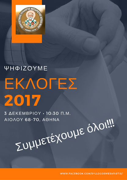 Την Κυριακή, 3 Δεκεμβρίου και ώρα 10:30 π.μ. στα γραφεία μας Αιόλου 68-70 στην Αθήνα, η ΜΕΣΑΡΙΣΤΑ ψηφίζει για την ανάδειξη νέου Διοικητικού Συμβουλίου.