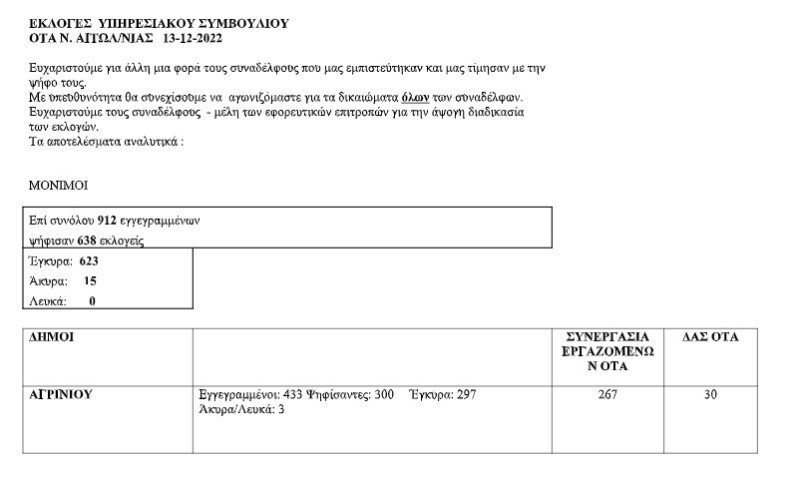 Την Τρίτη, 13 Δεκεμβρίου πραγματοποιήθηκαν οι Εκλογές του Υπηρεσιακού Συμβουλίου Ο.Τ.Α. Νομού Αιτωλοακαρνανίας, εκεί όπου πρώτος αναδείχθηκε ο συνδυασμός «Συνεργασία Εργαζομένων» του Θύμιου Κομματά με 232 σταυρούς.