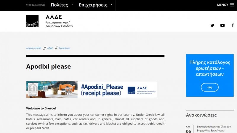 Στην ιστοσελίδα της Α.Α.Δ.Ε. έχει αναρτηθεί ειδική εφαρμογή με τίτλο ”Apodixi please”, για την ενημέρωση και εξυπηρέτηση των ξένων καταναλωτών σε θέματα φοροδιαφυγής.