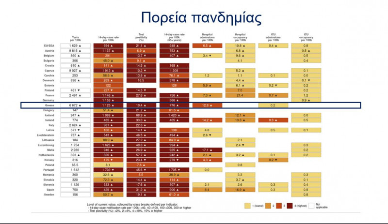 Παράλληλα, παρουσιάστηκε σχετικός πίνακας με τα τεστ στα κράτη της Ευρωπαϊκής Ένωσης με την Ελλάδα να βρίσκεται στη δεύτερη θέση (μετά την Κύπρο) στον αριθμό των τεστ, που πραγματοποιούνται ανά 100.000 πληθυσμό.