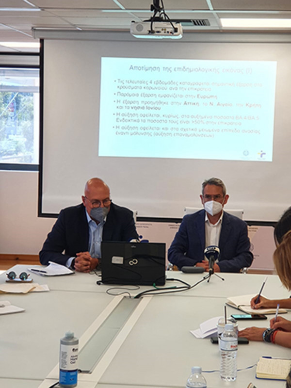 Την επιδημιολογική εικόνα της χώρας μας, τις τελευταίες εβδομάδες, παρουσίασε σε συνέντευξη τύπου, το πρωί της Δευτέρας, 4 Ιουλίου 2022, ο Πρόεδρος του Εθνικού Οργανισμού Δημόσιας Υγείας (ΕΟΔΥ), κ. Θεοκλής Ζαούτης, Καθηγητής Παιδιατρικής, πλαισιωμένος από τους δύο Αντιπροέδρους του Οργανισμού, τον κ. Δημήτριο Παρασκευή, Αναπληρωτή Καθηγητή Επιδημιολογίας – Προληπτικής Ιατρικής, της Ιατρικής Σχολής του ΕΚΠΑ και τον κ. Γιώργο Παναγιωτακόπουλο, Επίκουρο Καθηγητή Φαρμακολογίας, της Ιατρικής Σχολής του Πανεπιστημίου Πατρών.
