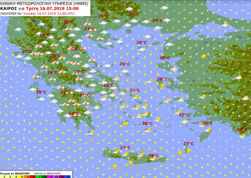Νέα μεταβολή του καιρού προβλέπεται από τις απογευματινές ώρες της Τρίτης (16-07-2019) και από τα δυτικά, με ισχυρές βροχές και καταιγίδες που θα συνοδεύονται πρόσκαιρα κατά τόπους από χαλαζοπτώσεις και ισχυρούς ανέμους.