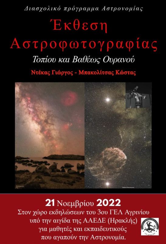 Η Έκθεση «Αστροφωτογραφίας Τοπίου και Βαθέως Ουρανού» των Γ. Ντέκα και Κ. Μπακολίτσα, φιλοξενείται στον χώρο εκδηλώσεω1ν του 3ου ΓΕ.Λ. Αγρινίου από τις 21 Νοεμβρίου 2022.