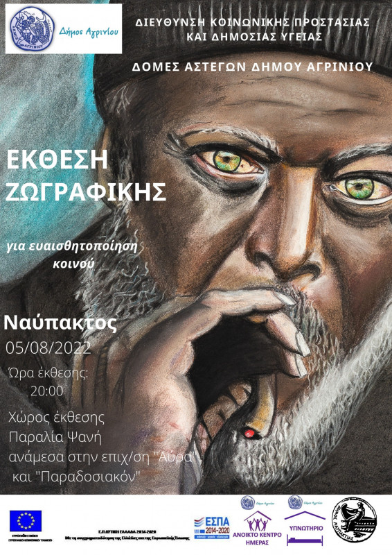 Οι Δομές Αστέγων Δήμου Αγρινίου, Υποέργο α/α 1: Ανοικτό Κέντρο Ημέρας και Υποέργο α/α 2: Υπνωτήριο της Διεύθυνσης Κοινωνικής Προστασίας και Δημόσιας Υγείας του Δήμου Αγρινίου έχοντας ως κύριο στόχο την ευαισθητοποίηση και ενημέρωση των πολιτών, θα πραγματοποιήσει έκθεση ζωγραφικής σε συνεργασία με τον Δήμο Ναυπάκτου με θέμα την Αστεγία στις 05/08/2022 με ώρες κοινού 20:00