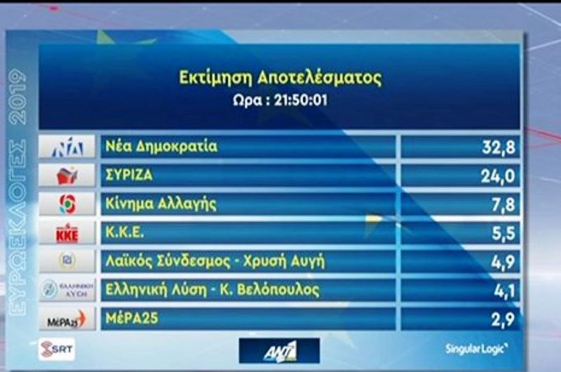 Σύμφωνα με εκτίμηση της Singular Logic από 2000 εκλογικά τμήματα και με ενσωματωμένο το 10 % των ψήφων, η ΝΔ εξασφαλίζει 32,8%, ο ΣΥΡΙΖΑ 24%, το Κίνημα Αλλαγής 7,8%, το ΚΚΕ 5,5%, η ΧΑ 4,9%, η Ελληνική Λύση 4,1%, το ΜέΡΑ25 2,9%, η Πλεύση Ελευθερίας 1,6%, η Ένωση Κεντρώων 1,5%, το Ποτάμι 1,4%, οι ΑΝΕΛ ο,8%, η ΛΑΕ 0,6% και η ΑΝΤΑΡΣΥΑ 0,6%.