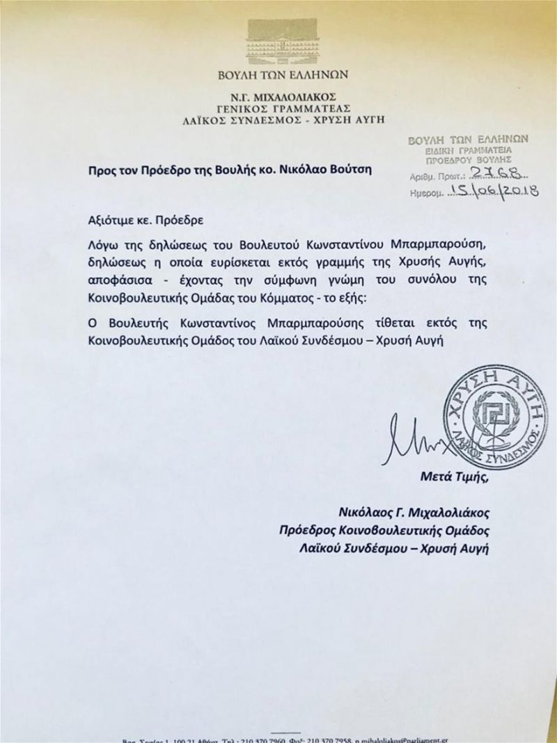 Επιστολή με την οποία γνωστοποιείται ότι τίθεται εκτός της κοινοβουλευτικής ομάδας της Χρυσής Αυγής ο βουλευτής Κωνσταντίνος Μπαρμπαρούσης απηύθυνε στο προεδρείο της Βουλής ο Νίκος Μιχαλολιάκος.