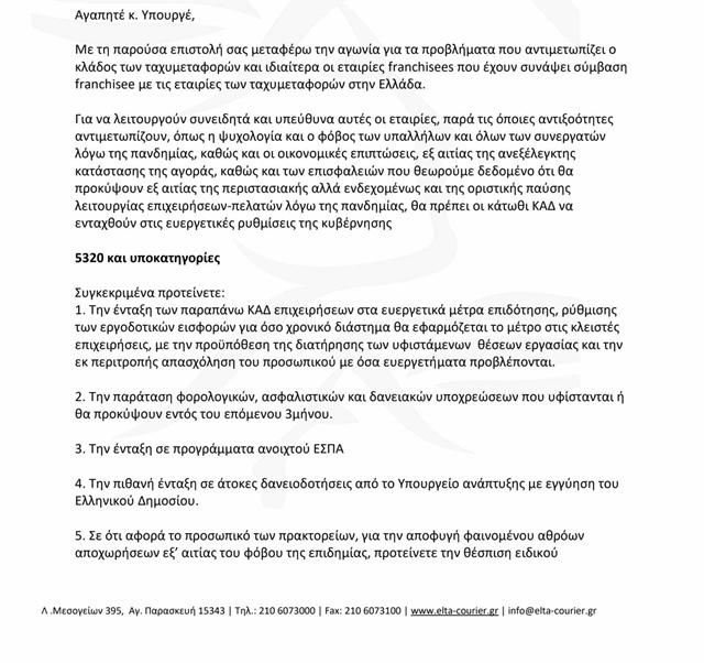 «Σας μεταφέρω την αγωνία για τα προβλήματα που αντιμετωπίζει ο κλάδος» τόνιζε ο διευθύνων σύμβουλος των Ταχυμεταφορές ΕΛΤΑ και ζητούσε την ένταξη του ΚΑΔ των ΕΛΤΑ στα ευεργετικά μέτρα επιδότησης, ρύθμισης των εργοδοτικών εισφορών με την προϋπόθεση της διατήρησης του υφιστάμενου αριθμού των εργαζόμενων, την παράταση των φορολογικών, ασφαλιστικών και δανειακών υποχρεώσεων, την ένταξη στα προγράμματα ανοιχτού ΕΣΠΑ και σε άτοκες δανειοδοτήσεις από το υπουργείο Ανάπτυξης με την εγγύηση του Ελληνικού Δημοσίου, τη θέσπιση ανθυγιεινού επιδόματος ίσο με το 50% του επιδόματος των 534 ευρώ.