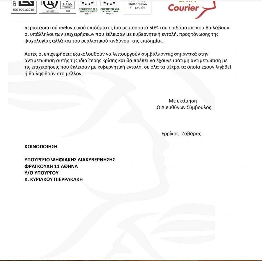 Παρακαλούσαν τα ΕΛΤΑ να ενταχθούν στις πληττόμενες επιχειρήσεις, όπως οι άλλες ιδιωτικές εταιρείες ταχυμεταφορών. Μέχρι και επιστολή στον υπουργό Ψηφιακής Διακυβέρνησης Κυριάκο Πιερρακάκη απέστειλε ο διευθύνων σύμβουλος των ΕΛΤΑ Courier Ερρίκος Τζαβάρας. Υπογραμμίζεται ότι όλες οι ιδιωτικές εταιρείες (έναν χώρο στον οποίο κυριαρχεί η ACS του πρώην προέδρου του ΣΕΒ) είναι ενταγμένες σ’ αυτό το καθεστώς έχοντας μειωμένα ενοίκια και χρηματοδοτικές διευκολύνσεις από το Δημόσιο.