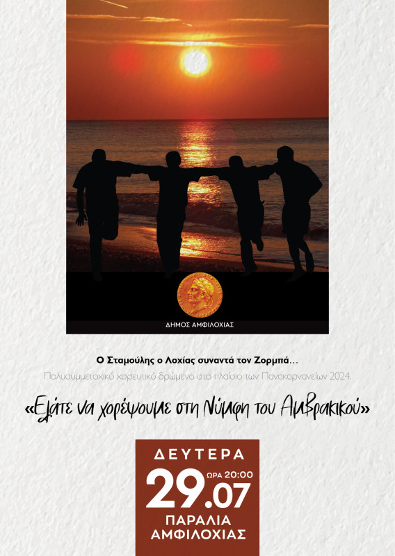 Ο Δήμος Αμφιλοχίας απευθύνει ανοιχτή πρόσκληση σε όλους τους συμπολίτες μας να δουν από κοντά το πολυσυμμετοχικό χορευτικό δρώμενο με το σύνθημα «Ελάτε να χορέψουμε στη Νύμφη του Αμβρακικού».