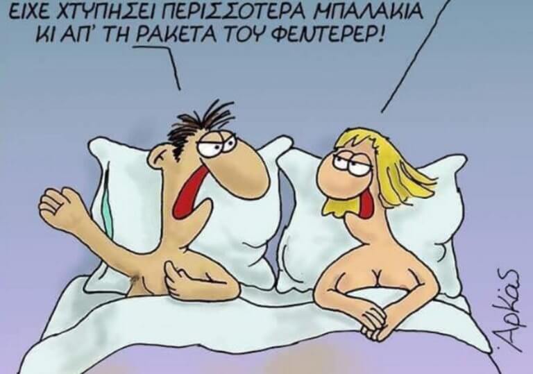 Το πρώτο δείχνει ένα ζευγάρι στο κρεβάτι, με την γυναίκα να λέει: «Σου είπα ότι δεν μου αρέσει το στοματικό σεξ!» και τον άντρα να απαντά: «Ναι, αλλά μόνο μαζί μου!… Γιατί πριν από μένα το σαγόνι σου είχε χτυπήσει περισσότερα μπαλάκια κι απ’ τη ρακέτα του Φέντερερ!».
