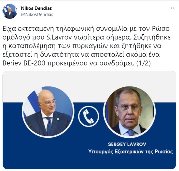 Ο Νίκος Δένδιας με αναρτήσεις του στο Twitter ανέφερε πως ζήτησε από τον Σεργκέι Λαβρόφ να εξεταστεί η αποστολή ενός ακόμη Beriev προκειμένου να συνδράμει στην καταπολέμηση των πυρκαγιών.
