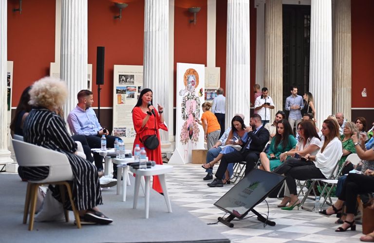 Η collage street artist Άννα Δημητρίου, βραβευμένη καλλιτέχνης στο είδος της, φιλοτέχνησε ένα εντυπωσιακό έργο της για την έμφυλη βία κατά τη διάρκεια της συζήτησης.