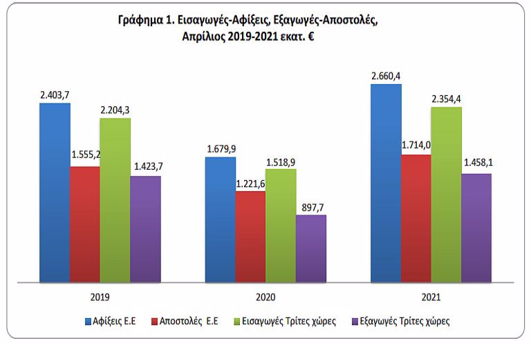 Η συνολική αξία των εξαγωγών – αποστολών, κατά τον μήνα Απρίλιο 2021 ανήλθε στο ποσό των 3.172,1 εκατ. ευρώ (3.803,0 εκατ. δολάρια) έναντι 2.119,3 εκατ. ευρώ (2.308,9 εκατ. δολάρια) κατά τον ίδιο μήνα του έτους 2020 παρουσιάζοντας αύξηση, σε ευρώ, 49,7%.
