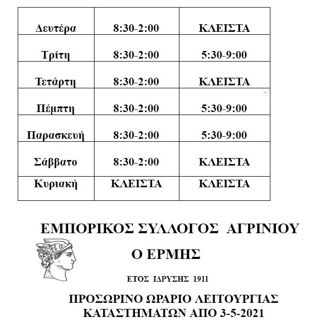 Ενημέρωση του Εμπορικού Συλλόγου Αγρινίου για τα τελευταία μέτρα που ισχύουν για το εμπόριο καθώς και το προσωρινό ωράριο λειτουργίας που ισχύει από τις 3 του Μάη.