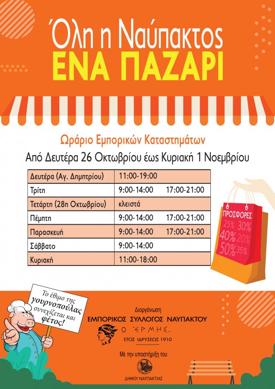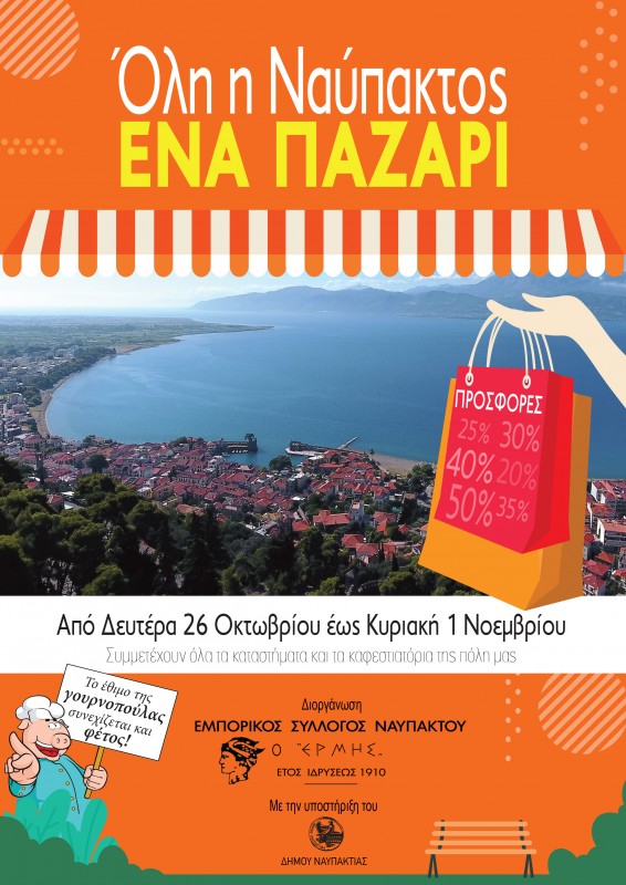 Από τις 26 Οκτωβρίου του Αγίου Δημητρίου έως την Κυριακή 1 Νοεμβρίου τα καταστήματα της Ναυπάκτου με Εκπτώσεις και Προσφορές μεταφέρουν τα παζάρια μέσα στα καταστήματα!!!