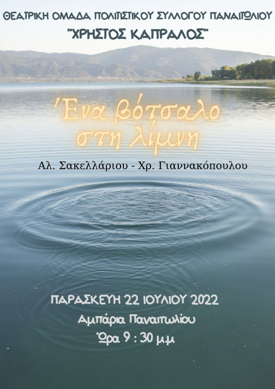 Η Θεατρική Ομάδα του Πολιτιστικού Συλλόγου Παναιτωλίου «Χρήστος Καπράλος» παρουσιάζει την κωμωδία των Αλ. Σακελλάριου και Χρ. Γιαννακόπουλου, «Ένα βότσαλο στη Λίμνη», στο υπαίθριο Θέατρο του ΚΕ.ΠΕ.ΤΡΙ., στ’ Αμπάρια Τριχωνίδας, την Παρασκευή, 22 Ιουλίου 2022 και ώρα 21:30.