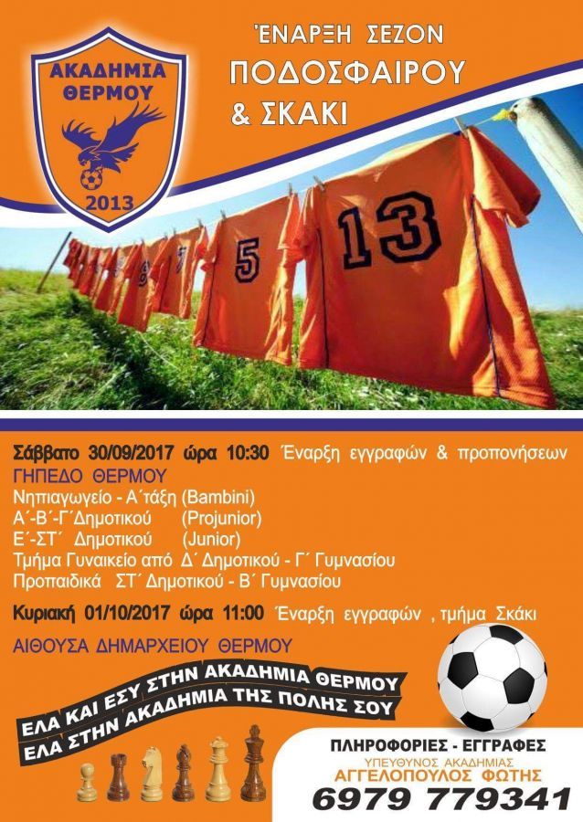 Έναρξη των εγγράφων και των προπονήσεων για την αγωνιστική περίοδο 2017-2018 στις 30 Σεπτεμβρίου για τα τμήματα της Ακαδημίας Θέρμου.
